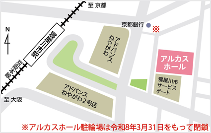 京阪電車の高架の手前にある「平池町」交差点を右折し、二つ目の「寝屋川市駅前」交差点を左折してすぐの一方通行道路を進入(左折)すると、右手の白い建物がアルカスホールです。